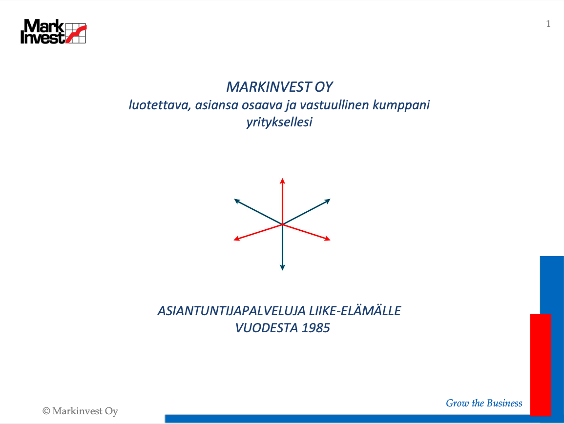 Markinvest Oy:n asiantuntijat ovat kokeneita markkinoinnin ja liiketoiminnan kehittäjiä, luotettavia kumppaneitasi kun haluat kehittää vientiä ja liiketoimintaasi Suomessa, Venäjällä ja Kazakstanissa. Markinvest Oy täydentää Team Finland kansainvälistymispalveluja omalla erikoisosaamisellaan. Edistämme kansainvälistymistä ja kasvua, autamme suomalaisia, ruotsalaisia ja venäläisiä yrityksiä pärjäämään Suomessa, Venäjällä, Kazakstanissa ja muissa maissa.
